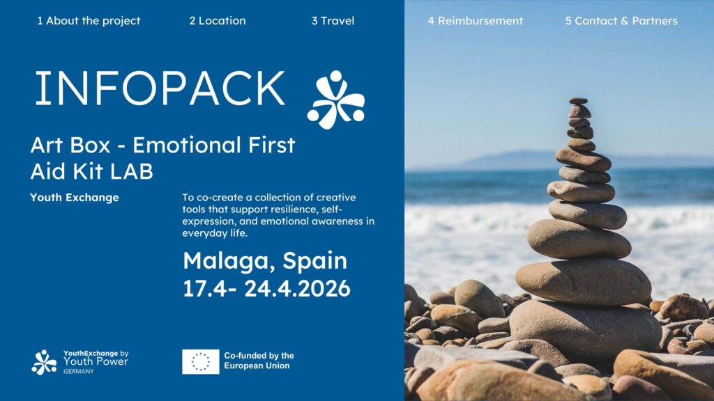 Art Box is a youth exchange in Málaga focused on promoting mental health and wellbeing through art-based exploration. In alignment with European Youth Goal #5, the project creates a safe and intercultural space where young people explore creative movement, visual arts, journaling, and nature-based practices as coping mechanisms for stress and emotional challenges. Through non-formal learning and shared reflection, participants co-create a practical “Art Box” — a collection of creative tools that support resilience, self-expression, and emotional awareness in everyday life.